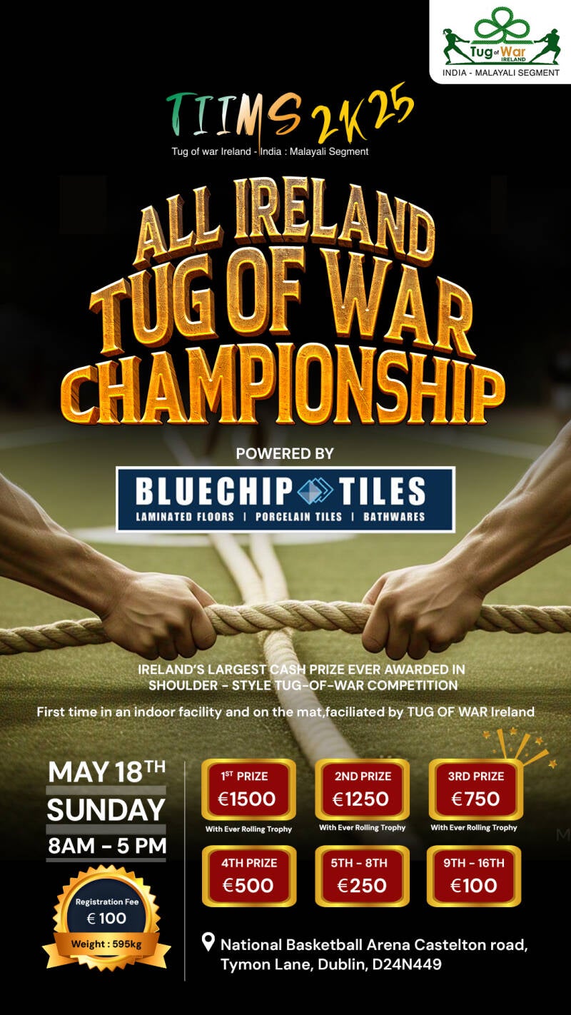 ഏവരും ആകാംക്ഷയോടെ കാത്തിരുന്ന വടം വലി മത്സരംTIIMS 2K25 വടം വലിമത്സരം മെയ് 18/ 2025 നടത്തും എന്ന് സംഘടകർ അറിയിച്ചു, അയർലണ്ടിലെ ഏറ്റവുമ വലിയ സമ്മാന തുകയും 4350 യൂറോ സമ്മാനത്തുകയും ,എവറോളിങ് ട്രോഫിയും 6 ടീമുകൾക്കായിട്ടന്ആണ് നൽകുക, നാഷണൽ ബാസ്കറ്റ്ബോൾ അറീനയിൽ നടക്കുന്ന മത്സരം ഇൻഡോർ മത്സരത്തിൽ ഐറിഷ് ടീമുകളും പങ്കടുന്നുന്നുണ്ട്. കൂടൂതൽ, 595 കിലോ വിഭാഗത്തിലായിരിക്കും മത്സരമാണ് നടക്കുന്നത് എന്ന് സംഘടകർ അറിയിച്ചു.കൂടുതൽ വിവരങ്ങൾ അറിയുന്നതിന്TIIMS 2K25 അസോസിയേഷനും മായി ബന്ധപെടുക.
