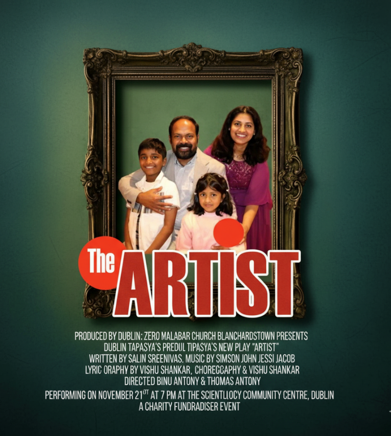 ഡബ്ലിൻ: സീറോ മലബാർ ചർച്ച് ബ്ലാഞ്ചസ്റ്റൗൺ അവതരിപ്പിക്കുന്ന ഡബ്ലിൻ തപസ്യയുടെ പുതിയ നാടകമായ ‘ആർട്ടിസ്റ്റ്’ നവംബർ 21-ന് വൈകിട്ട് ഏഴ് മണിക്ക് ഡബ്ലിനിലെ സൈന്റോളജി കമ്മ്യൂണിറ്റി സെന്ററിൽ അരങ്ങേറുന്നു. ‘ഇസബെൽ’, ‘ലോസ്റ്റ് വില്ല’, ‘ഒരുദേശം നുണ പറയുന്നു’, ‘പ്രളയം’ തുടങ്ങിയ പ്രേക്ഷക പ്രശംസ നേടിയ നിരവധി നാടകങ്ങൾ ഇതിനുമുമ്പ് ഡബ്ലിൻ തപസ്യ ഡ്രാമ ക്ലബിന്റെ ബാനറിൽ അവതരിപ്പിച്ചിട്ടുണ്ട്.