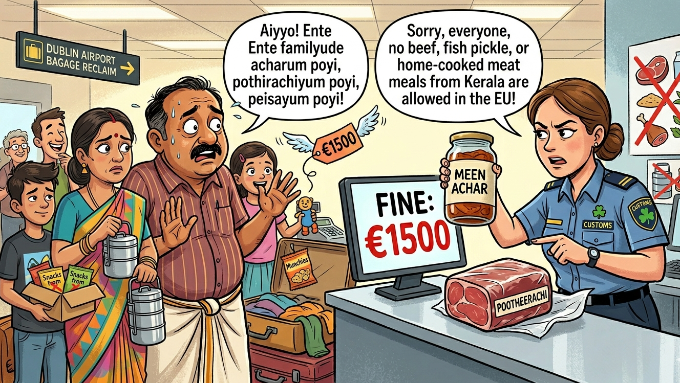 ഡബ്ലിൻ: അവധി കഴിഞ്ഞ് അയർലണ്ടിലേക്ക് മടങ്ങിയെത്തിയ മലയാളി കുടുംബത്തിന് ഡബ്ലിൻ എയർപോർട്ടിൽ കസ്റ്റംസ് അധികൃതർ വൻ തുക പിഴ ചുമത്തി. ബാഗേജിൽ സൂക്ഷിച്ചിരുന്ന പോത്തിറച്ചിയും മീൻ അച്ചാറും പിടിച്ചെടുത്തതിനെത്തുടർന്ന് ഏകദേശം 1.3 ലക്ഷം ഇന്ത്യൻ രൂപ (€1500) ആണ് ഇവർക്ക് പിഴയായി നൽകേണ്ടി വന്നത്. യൂറോപ്യൻ യൂണിയന് (EU) പുറത്തുനിന്നുള്ള രാജ്യങ്ങളിൽ നിന്നും ഇറച്ചി, പാൽ ഉൽപ്പന്നങ്ങൾ എന്നിവ കൊണ്ടുവരുന്നതിനായുള്ള കർശന നിരോധനം ലംഘിച്ചതിനാണ് ഈ നടപടി.